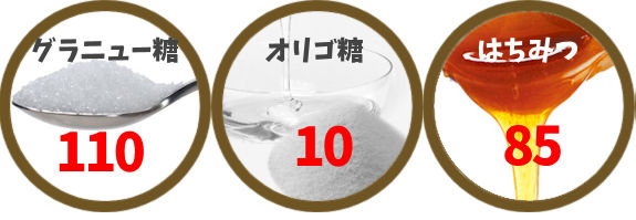 オリゴ糖はGI値が10~30程度で、グラニュー糖のGI値110に比べればかなり低いGI値です。