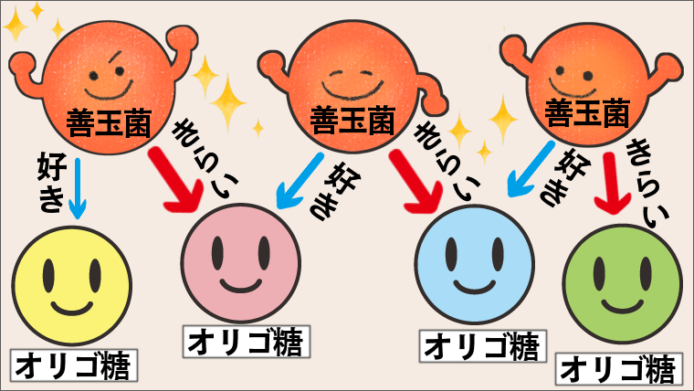 というふうに、善玉菌にもエサ(オリゴ糖)の好みがあるのです。