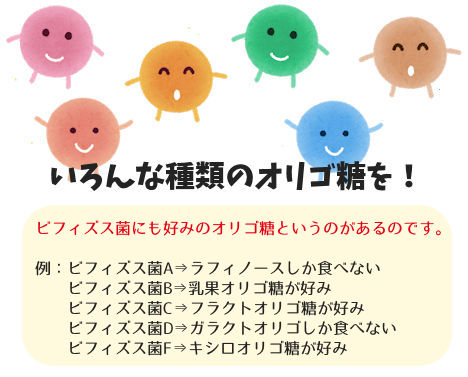 腸内に10種類以上いるビフィズス菌にまんべんなくエサを与えるためには、複数の種類のオリゴ糖を摂取するのが効果的です。