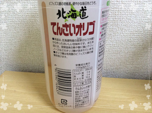 「北海道てんさいオリゴ」の原材料には「てんさい糖蜜」と記載があります。