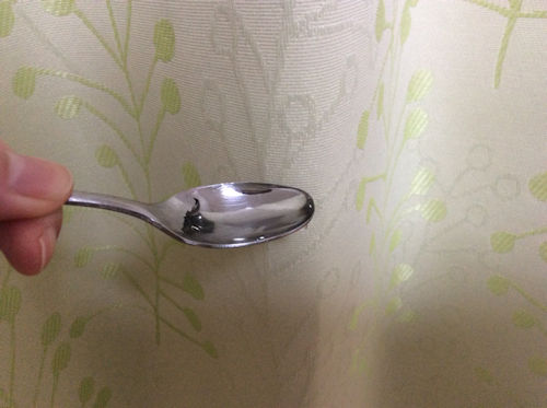 色は全体でみると淡い黄色ですが、スプーンにのせると無色透明でした。