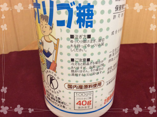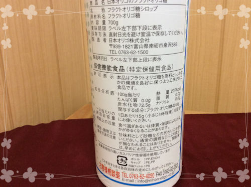 トクホ商品だからなのか、「国産原料使用」という表記と、「フラクトオリゴ糖 40gを含みます」との記載があります。