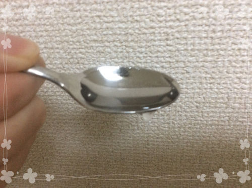 オリゴ糖の色は全体でみると少し褐色のかかった色でしたが、スプーンにのせると、さらさらの綺麗な透明色をしています。