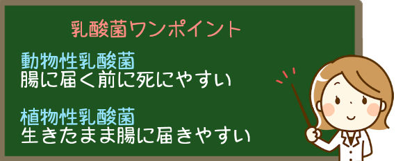 ただ、乳酸菌には動物性乳酸菌と植物性乳酸菌の2種類があり、動物乳酸菌の多くは腸に届く前に死んでしまうことが多く、腸内環境を整える作用が弱い場合も少なくありません。
