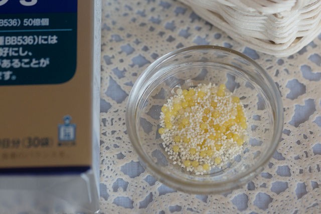 黄色いカプセルがビフィズス菌、白いカプセルが乳酸菌、白い顆粒がオリゴ糖です。