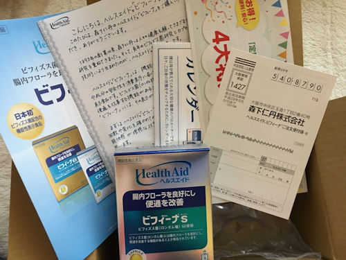 小さい箱には商品と挨拶状・通販カタログ・おなかチェックカレンダ-等が入っていました。
