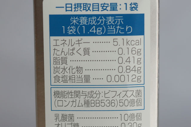 「ビフィーナS」はビフィズス菌(ロンガム種BB536)の数によって3段階用意されており、私はそのうちの真ん中(ビフィズス菌(ロンガム種BB536)50億個)を試しましたが、もう一つ上の段階(ビフィズス菌(ロンガム種BB536)100億個)も試してみたいと思いました。
