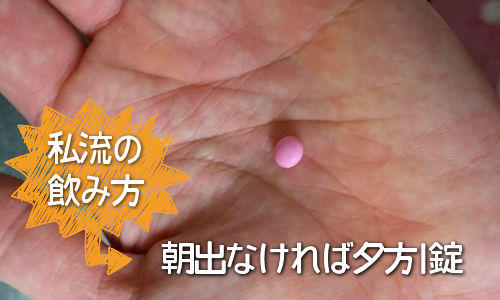 出なくてお腹がパンパンで辛い思いをするのよりは、夕方早い時間に1錠飲んで翌朝スッキリする方が体にもいいと思います。